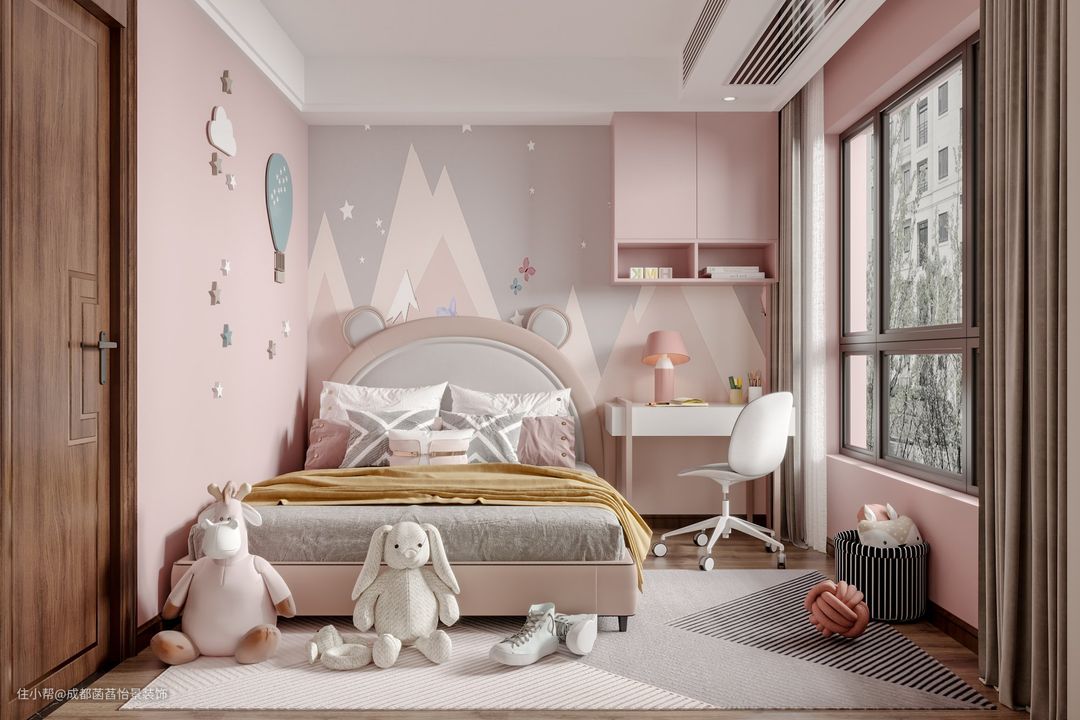 儿童房的设计粉嫩而浪漫,圆弧形的床头靠背与背景墙上的装饰造型,给孩子一个童真的空间,在床头设计了一个书桌,可以满足孩子日常的学习需求!
