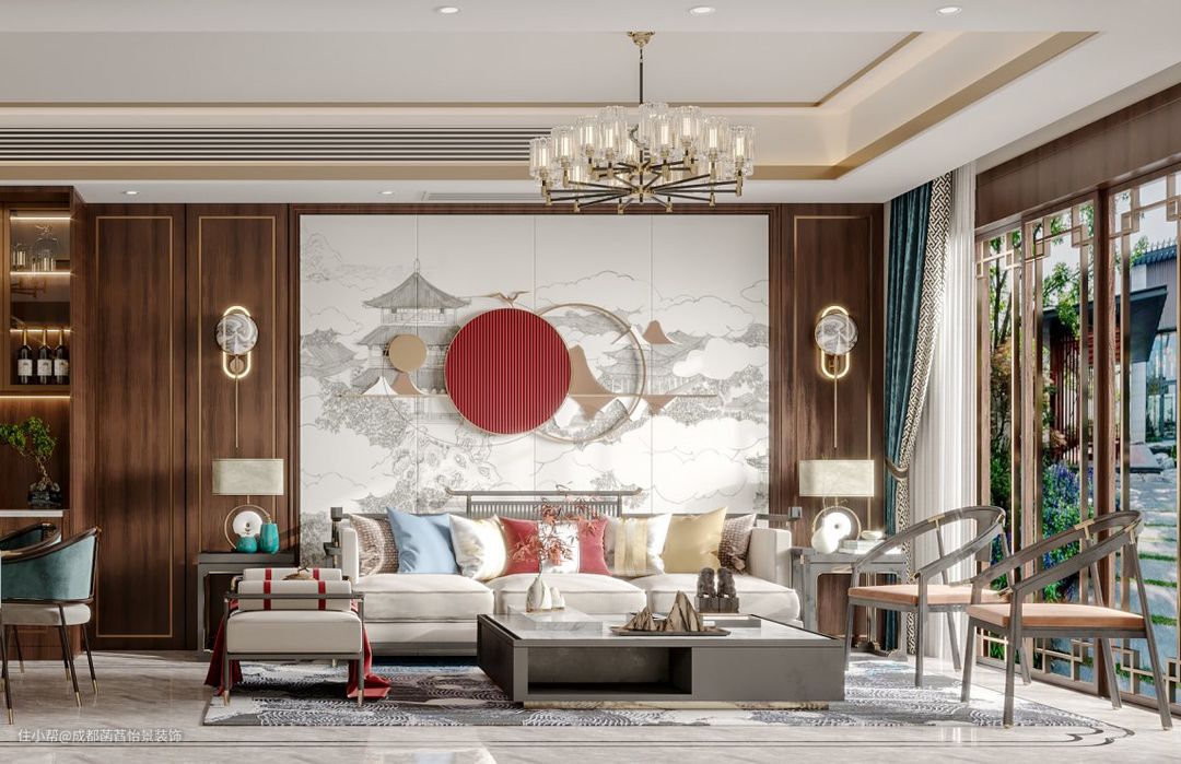 中式风格的沙发背景墙,搭配着立体的装饰与两侧壁灯的加入,整个空间给人一种中式的文化氛围,大大的落地窗为室内提供了一个明亮的氛围感。