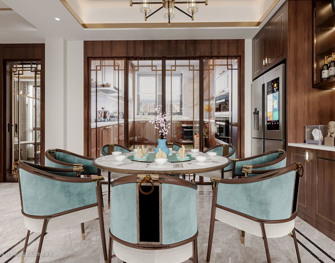 餐厅 的设计采用了部分中式的元素,圆形的石材餐桌搭配着实木的定制柜子,仿古的吊灯设计,浅蓝色的半包餐椅,给居家生活带来一股清流。