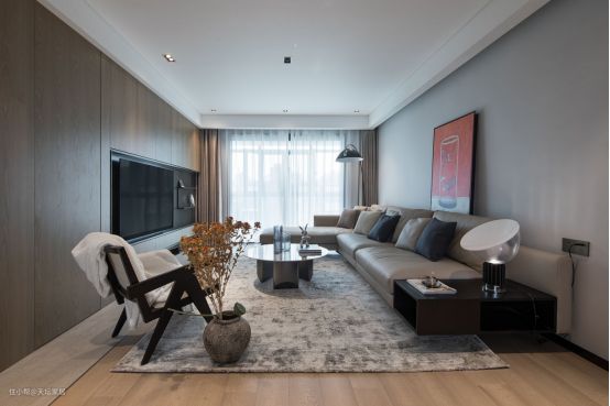 客厅采用木饰面打造电视背景墙,看似连贯一体、整齐干净,实则暗藏了一道隐形门。空间充满了不确定性,在动静状态下,创造无限的变化和可能。极具浪漫的层叠、碰撞、协调,在交错的光与阴翳之下,显现了漂浮的美感与诗意。