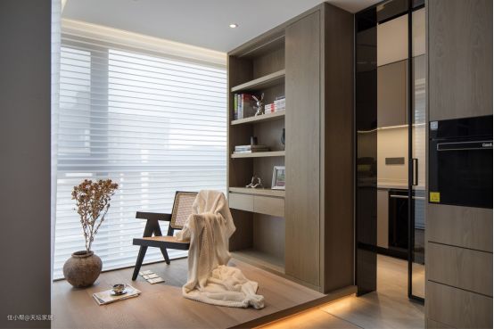 设计改善了梁体较多的复杂结构,重新调整布局,增设开放式空间。这个空间,没有唯一的定义,可在书房或休闲空间之间自由切换。为凸显窗景进行了地台设计,辅以灯光强化功能区域的划分。