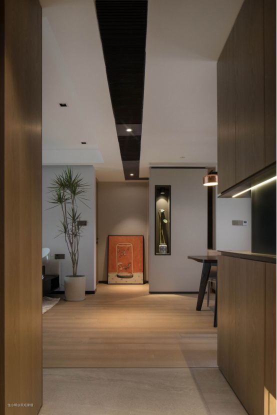 天花板上,通过一条深色的结构线,寻找空间贯穿、纵深、延伸的表达方式,完美处理好空调设备。地面部分,运用材料分割、强调、分化区域功能。半开放鞋柜既可收纳鞋子,又可摆放快递、钥匙等物品。