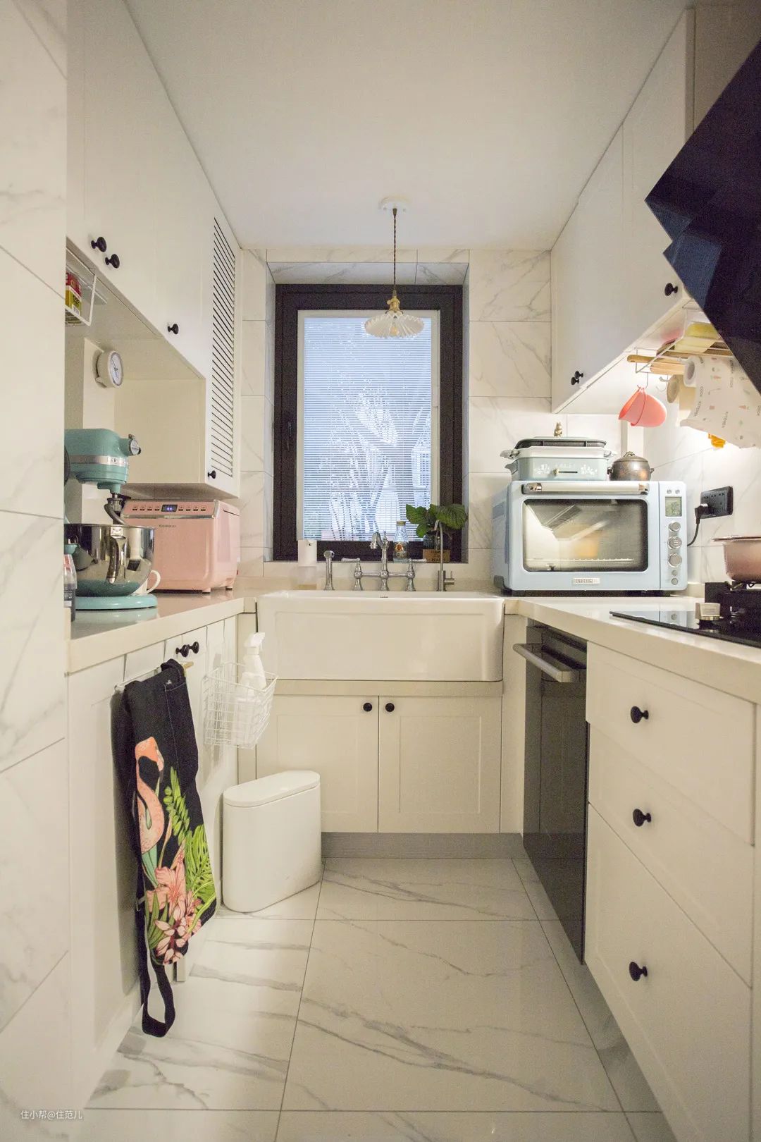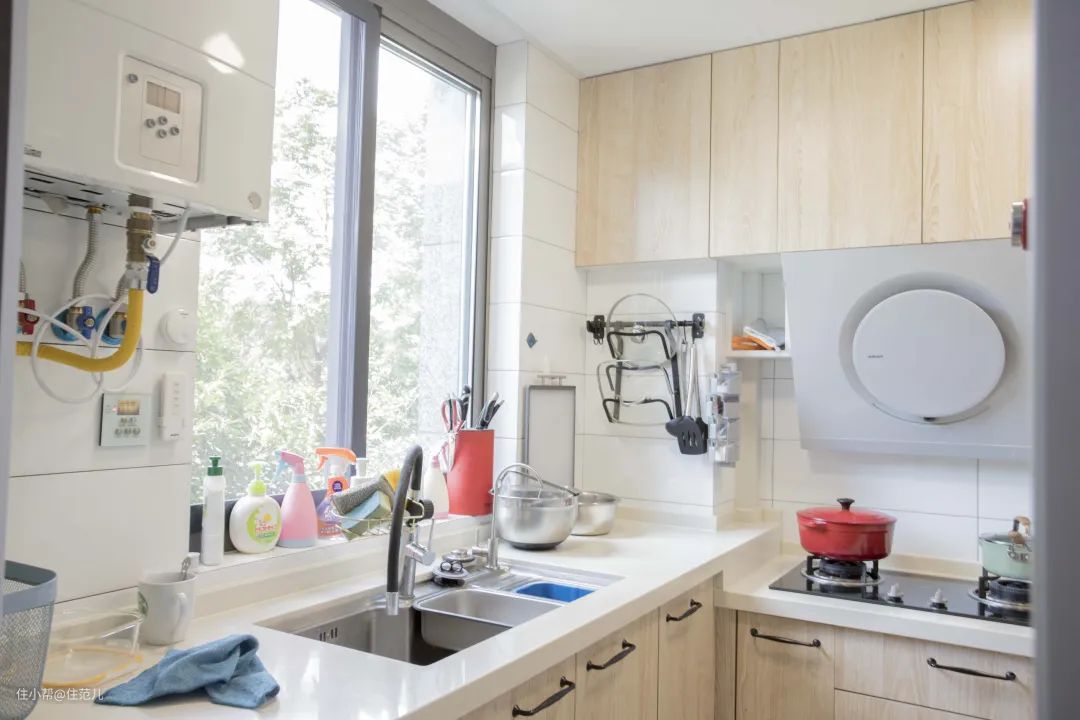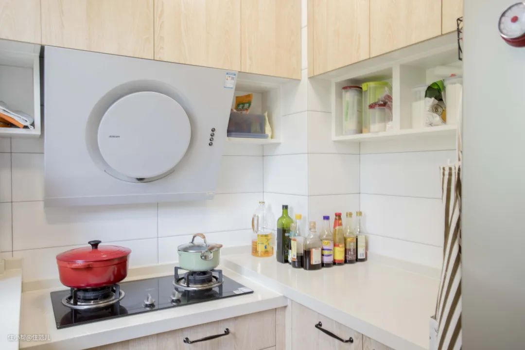 住范儿客户W先生的厨房,用水区域的台面高90cm,用火区域是80cm,冰箱旁的备餐区域是85cm,这样更适合夫妻俩的身高习惯来使用。