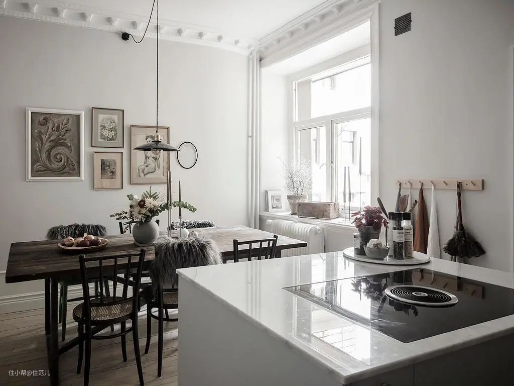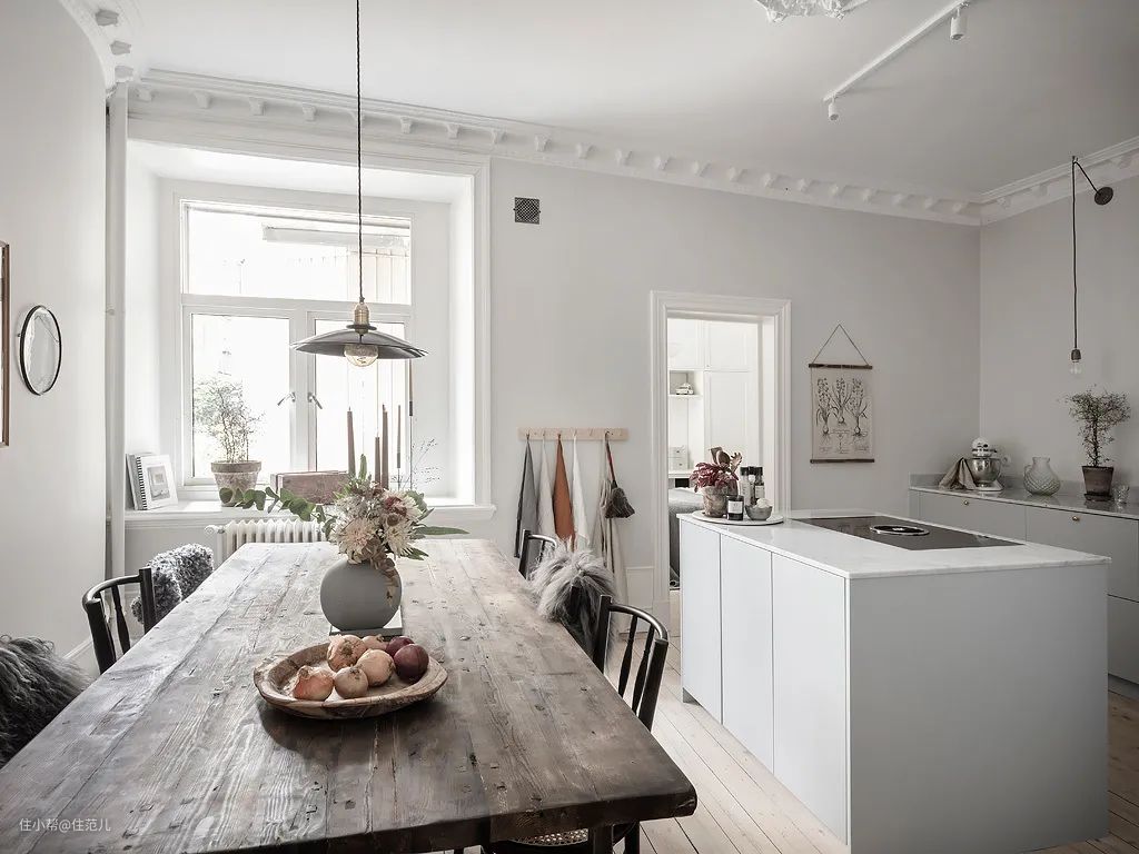 如果你的客餐厅铺了木地板,同样很推荐把木地板通铺延续到厨房。