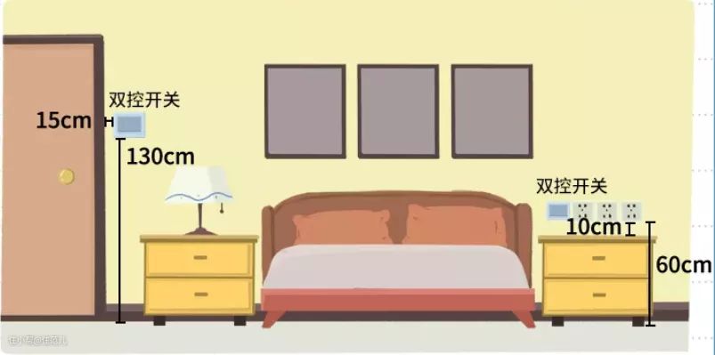 靠近门边的双控开关离门框15cm,离地面130cm;床旁边的开关,离地60cm左右就可以。