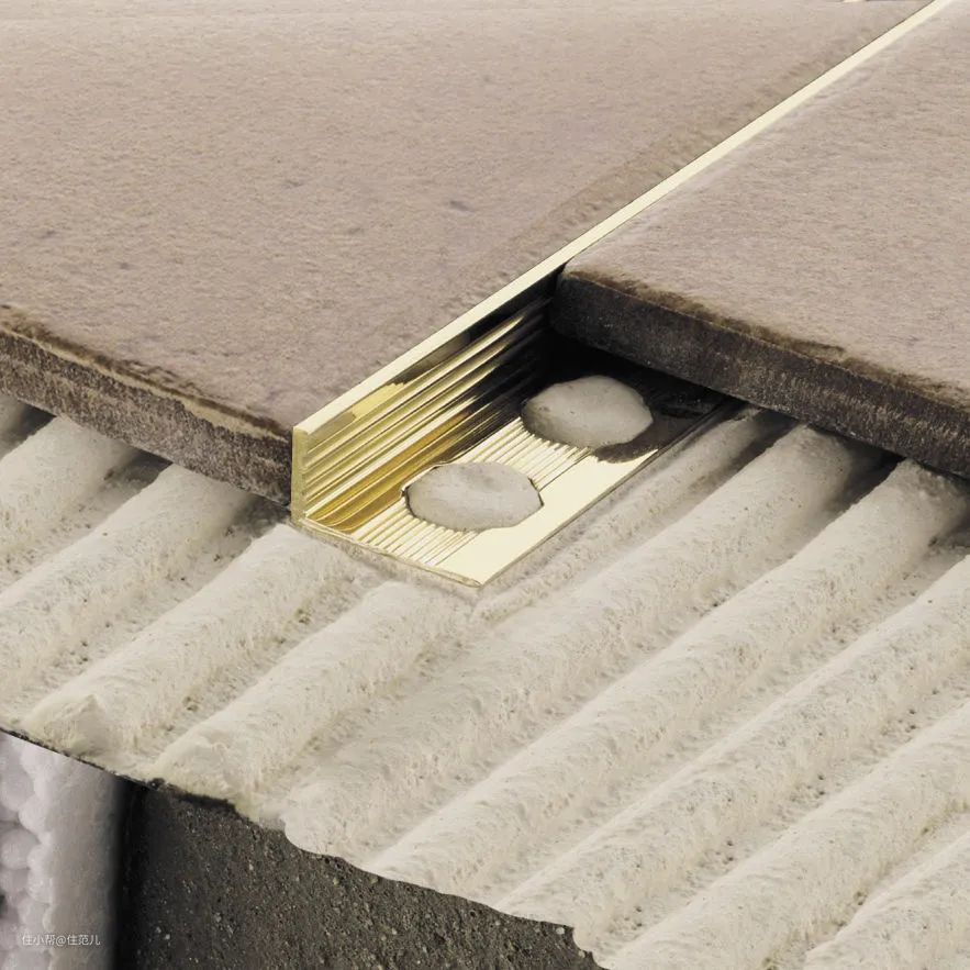 瓷砖和瓷砖之间不需要铺门槛石,镶2.5cm铜条,轻奢优雅,省工省料;瓷砖和木地板用3cm黑色收边条收边,简洁利落又省钱。