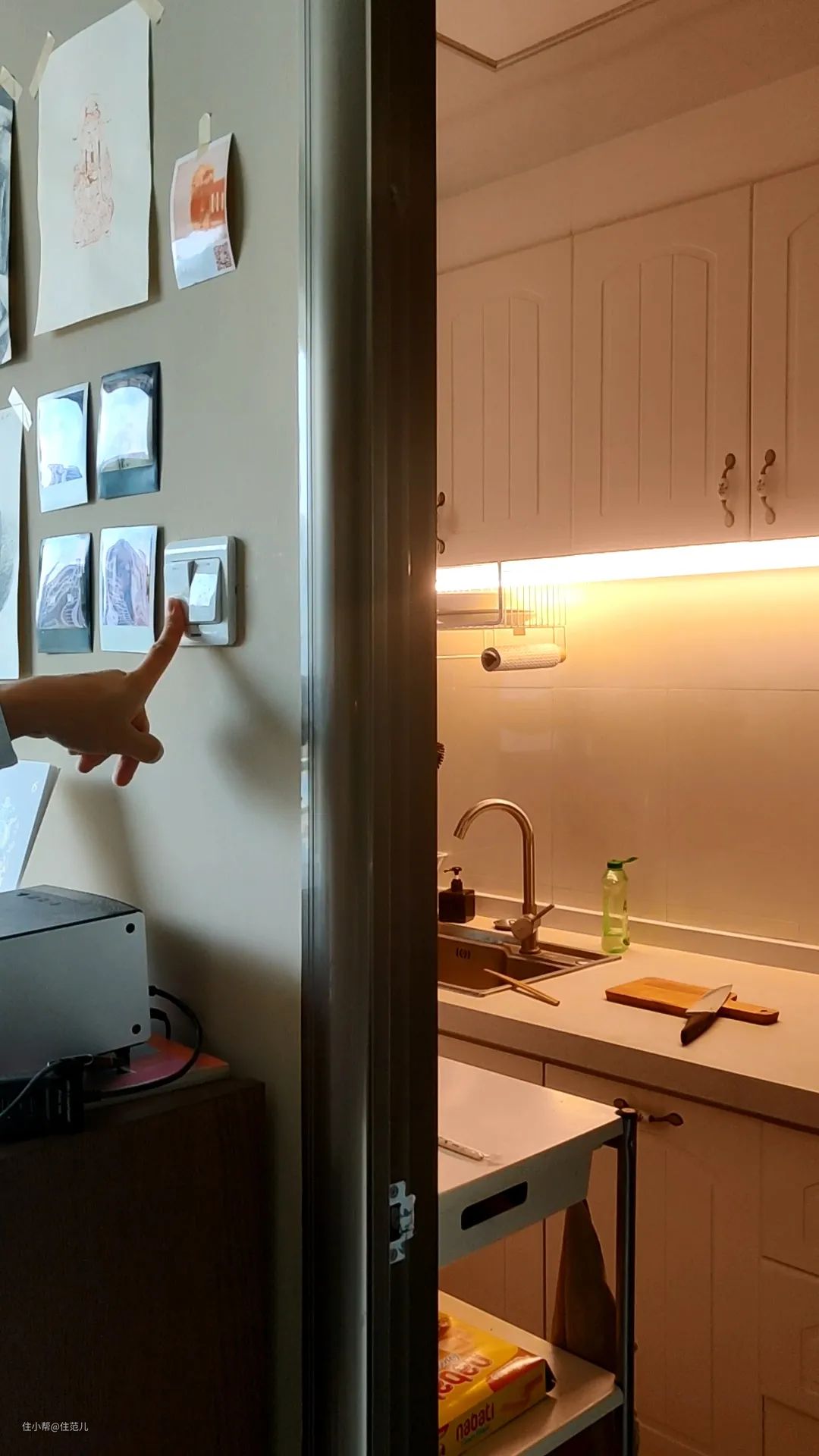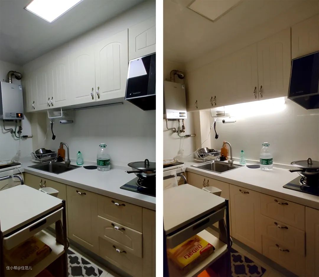 厨房只靠顶灯照明,还不如在吊柜下面装一条灯带,用作厨下照明,不开大灯也完全够亮,切菜洗碗反而看得更清楚了!