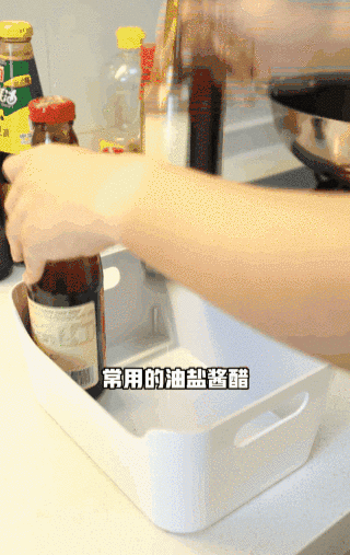 常用的油盐酱醋不用做拉篮收纳,用收纳盒装起来,存放在吊柜里,做饭的时候,取下来放台面上,做完饭再放回去,整齐又干净。