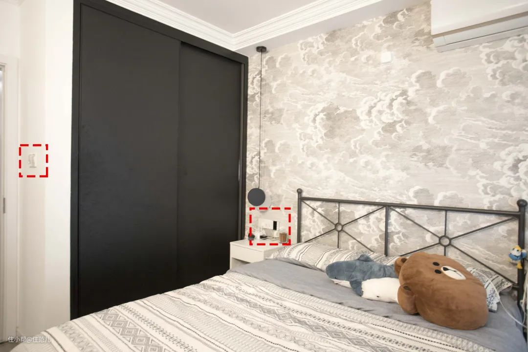 床头开关插座注意间距,1.8m的床是床垫宽,床本身宽度会到1.9甚至2m,注意间距,不要被床挡住了。