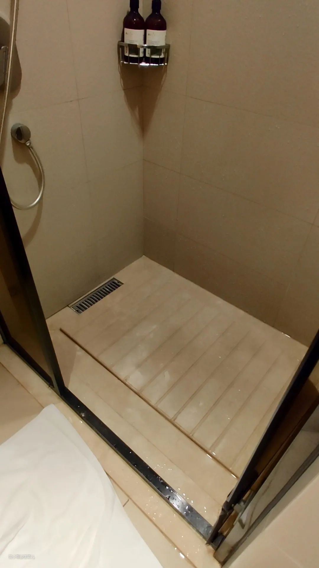 或者在花洒下方增加一块有拉槽的大理石,引导积水排除,也能更好的防滑。