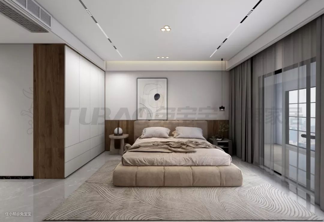主卧空间的设计采用软包的地台替代床的设计,床头背景仍是沉稳低调的胡桃木与纯色白墙的组合,在灯光的氛围中营造出视觉冲击与美学平衡。两侧不同的床头柜组合,大批对称带来的僵硬之感,是一种更为灵动的感觉。