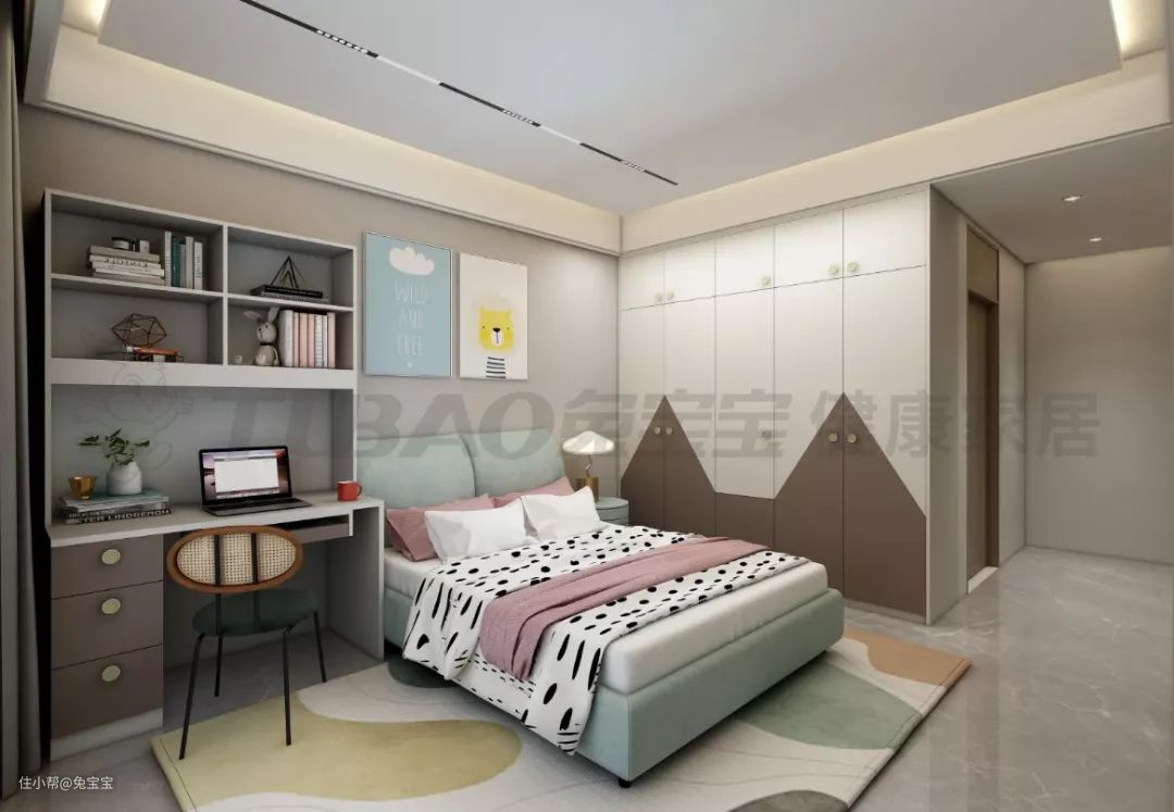 相对于其他空间的黑胡桃木,儿童房的色调选择更为活泼出挑,更适合儿童的年龄特性。柜门板选择分色的设计,带来更加独特的感觉。一侧的床头柜同样以更加实用的书桌柜替代,将空间利用到极致。
