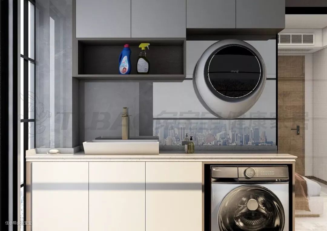 将靠近次卧一侧的阳台作为生活阳台使用,安排了洗衣机等设计,儿童洗衣机上墙,既方便清洗,又解放整理的空间,阳台的储物柜可作为收纳吸尘器等清洁工具的家政角,十分实用。