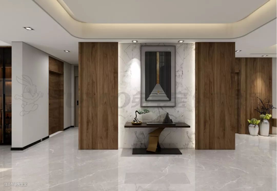 入户门厅没有做实际的作用,主要带给入户美的视觉感受,让归家更有仪式感。进门之后的端景墙,是以质感的大理石纹样与温润的黑胡桃木饰面组合,带来对称的美感。端景台上的假山石与迎客松盆栽,在灯光的照射下,带有点缀的效果,显得格外精致。