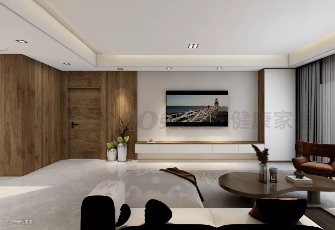 电视背景墙是极简的纯色与黑胡桃木饰面的组合,在暖光灯氛围下,让空间设计美学有了具体的画面。悬浮式的一字型电视柜与一侧的置顶柜组合,让人感受空间收纳的收与放、虚与实。