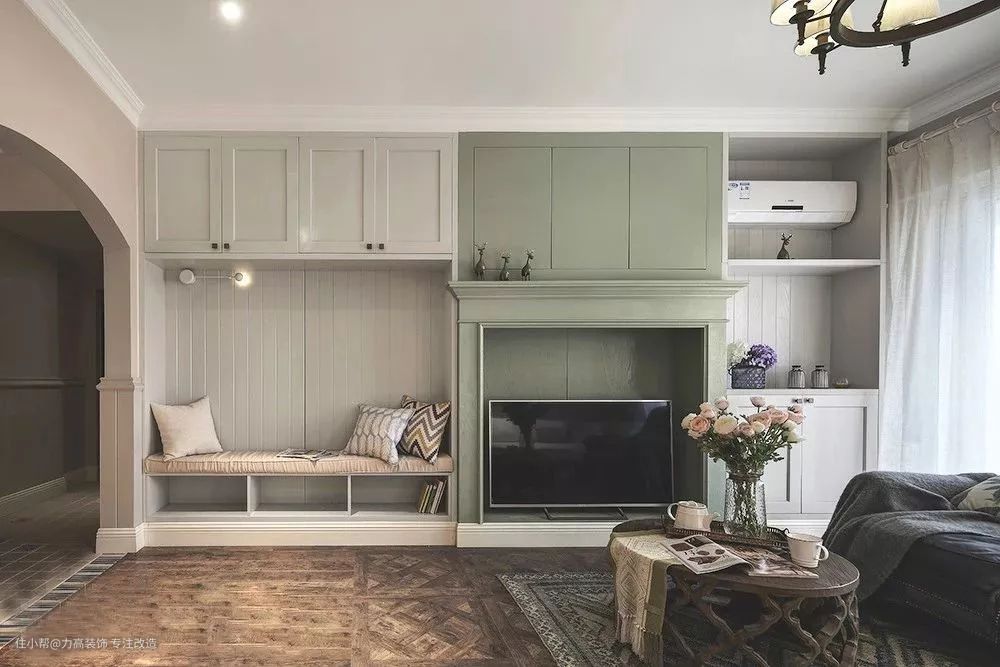 远处看上去只是一面普通的墙面,实际上是满满一墙面的储物空间,同时还可以用移门遮盖电视,打造一个没有电视的客厅。