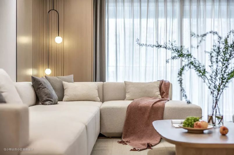 客厅以温暖自然的木色和纯净柔和的米色搭建起交流休憩的日常生活场景,四周木色圆弧设计形成包容通畅的围合感,肌理感剑麻地毯搭配斜纹沙发,串联起有关理想生活的画面,光着脚感受地毯带来的massage效果,或是盘腿席地而坐,看书、聊天、和谐美好。