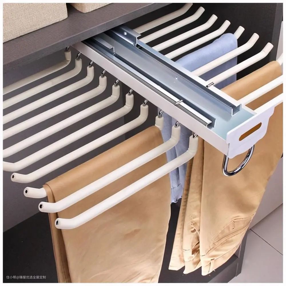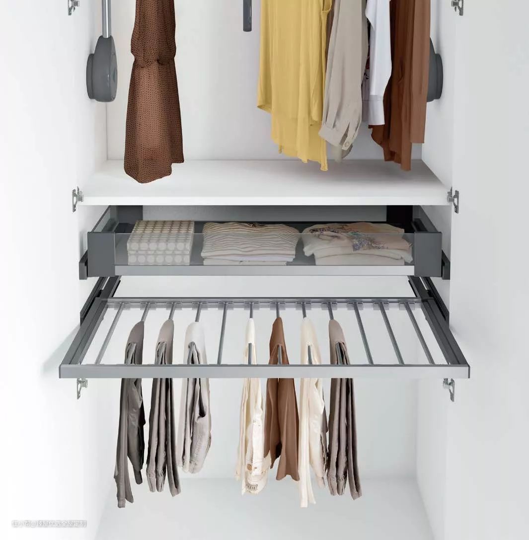 c.裤架区:有一些裤子材质,如果不悬挂起来就会起褶皱。而如果选择叠放收纳,每次穿的时候都需要熨烫,就会很麻烦。所以,要给裤子留一个专门的裤架区。高度不要低于70cm,在80cm-100cm之间为宜。