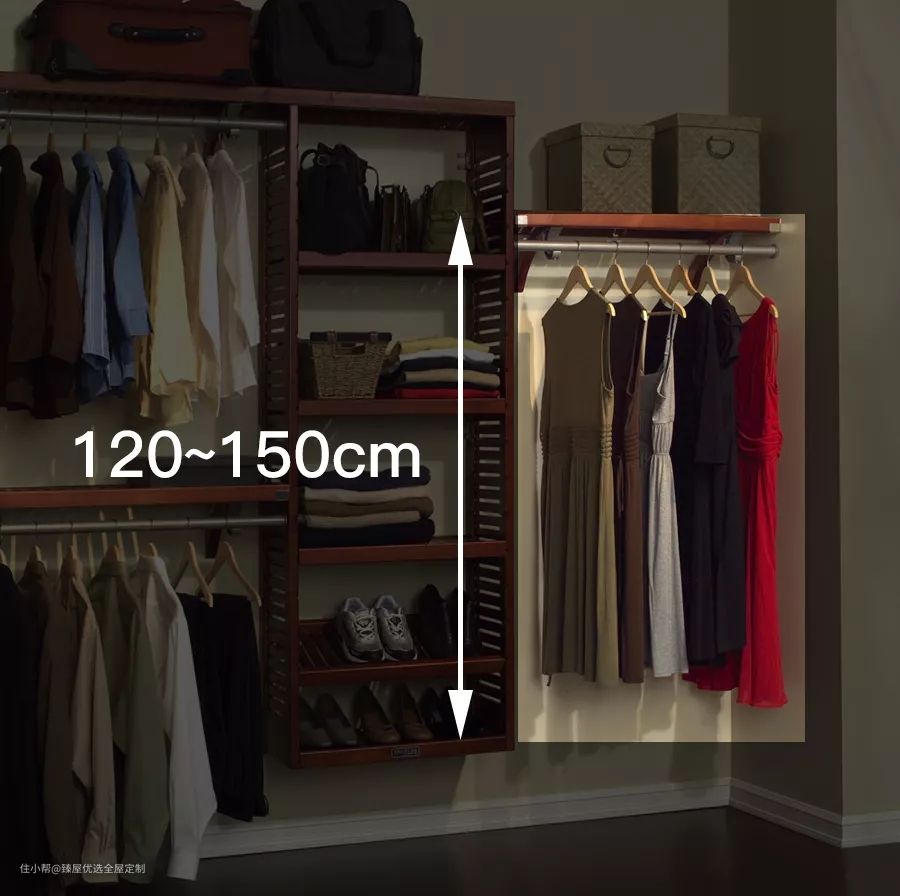 b.短衣区:悬挂区还可以分为短衣区,短衣区用来收纳衬衣、T恤、短袖等等短款衣物,建议高度还是不要小于90cm,一般可以设定在100cm-120cm之间,能够拥有足够的空间来收纳。