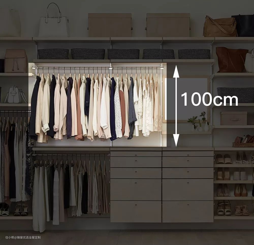 a.长衣区:长衣区用来收纳大衣、风衣、羽绒服、连衣裙等长款衣物,高度可以设定在120cm-150cm之间,挂杆的高度以踮脚可拿取到为宜,深度达到40cm即可。如果无法保证是否会买超长的衣物,小编建议底部最好不要设计隔板或抽屉,或者选择可移动的收纳盒,能够有效利用空间。
