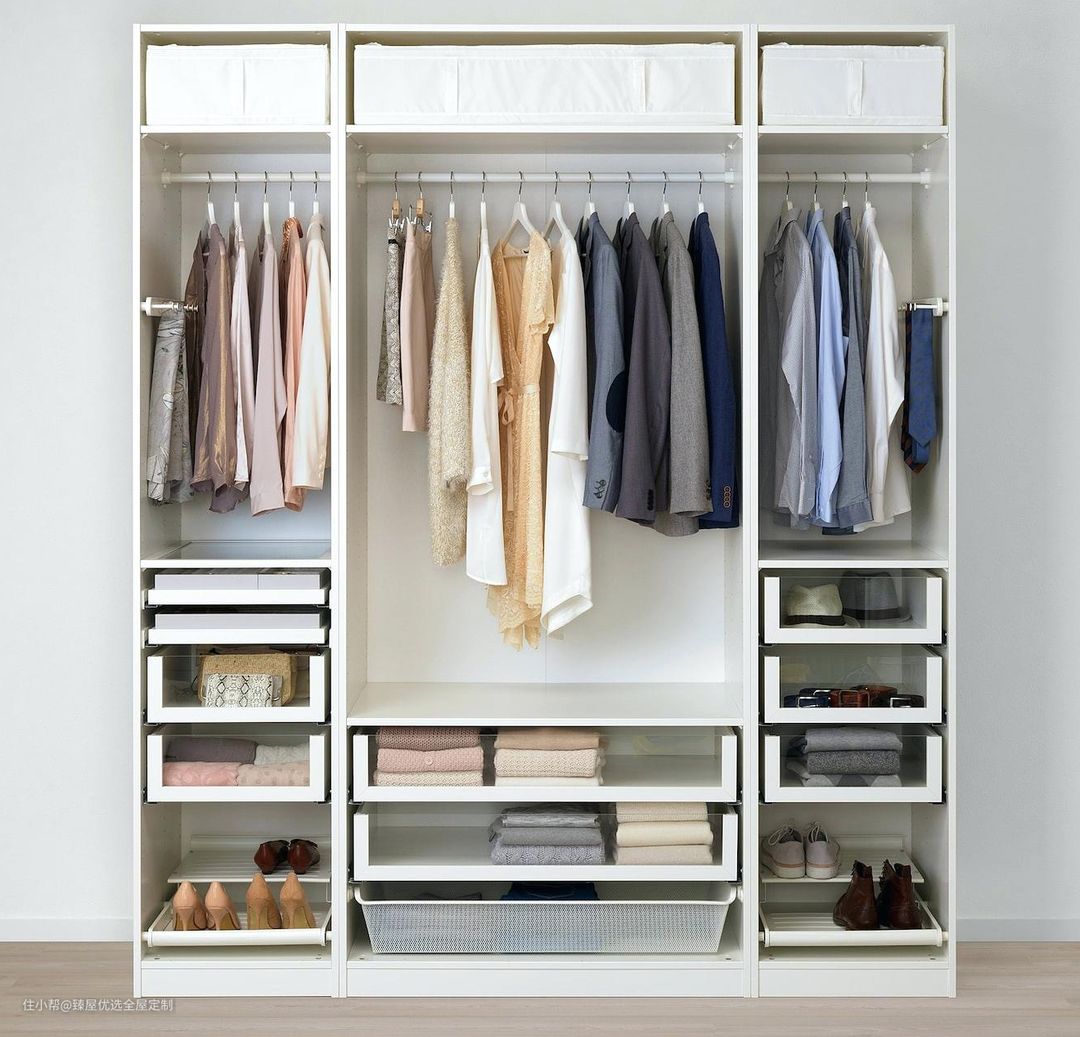 (3)抽屉区:一般来说,抽屉用来收纳一些小物品,例如:袜子、内衣、丝巾等等。抽屉可以在衣柜的下方单独放置,高度可以选择在15cm-20cm之间。将物品进行有效区分后,也更容易寻找。