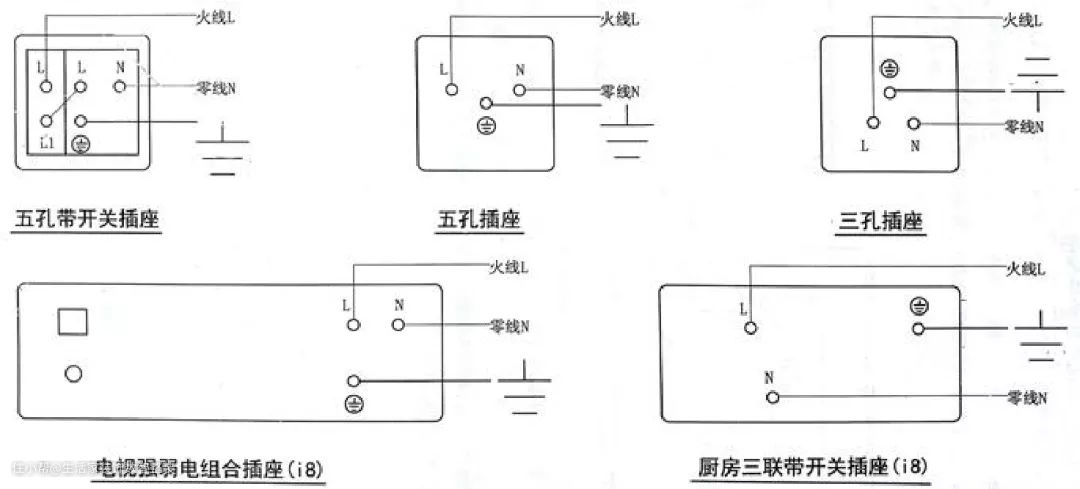 二孔插座连线为零线在左或下,相线在右或上;三孔插座连线为零线在左,相线在右,接地线在上。