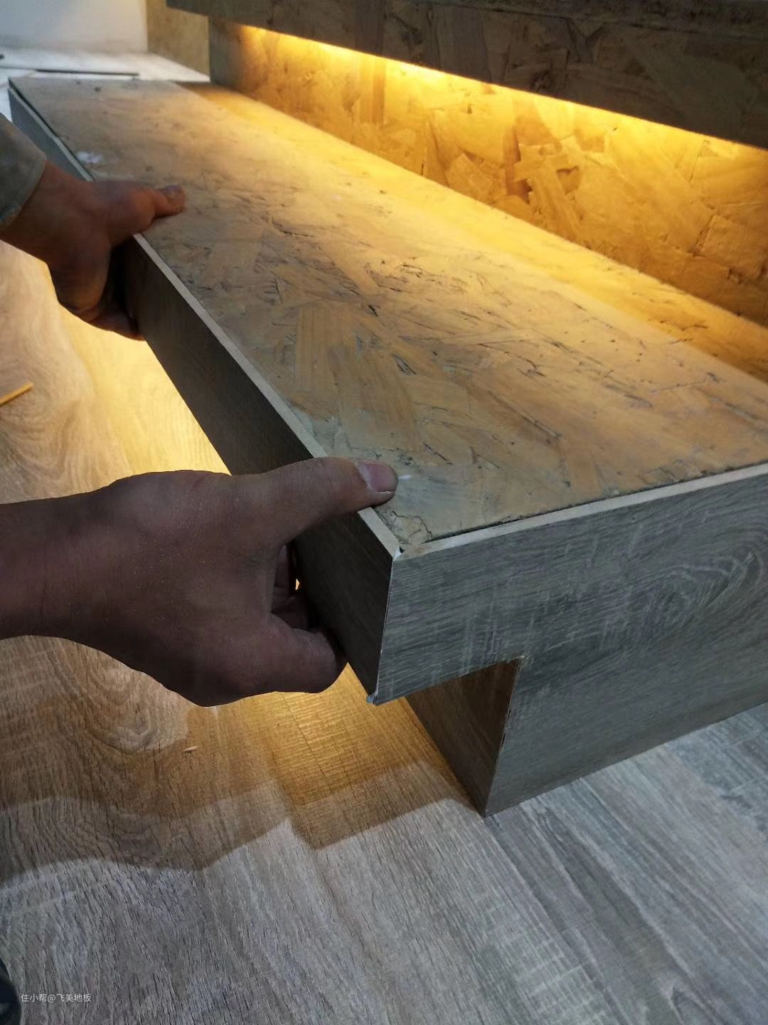第四步,也是最考验地板安装师傅手艺的,地台平台和立面木地板45°对角安装。