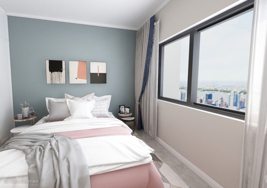 儿童房整体设计满满的少女心,淡蓝色墙面搭配三幅简约装饰画,清新脱俗,视觉上增大空间还很亮堂的感觉。
