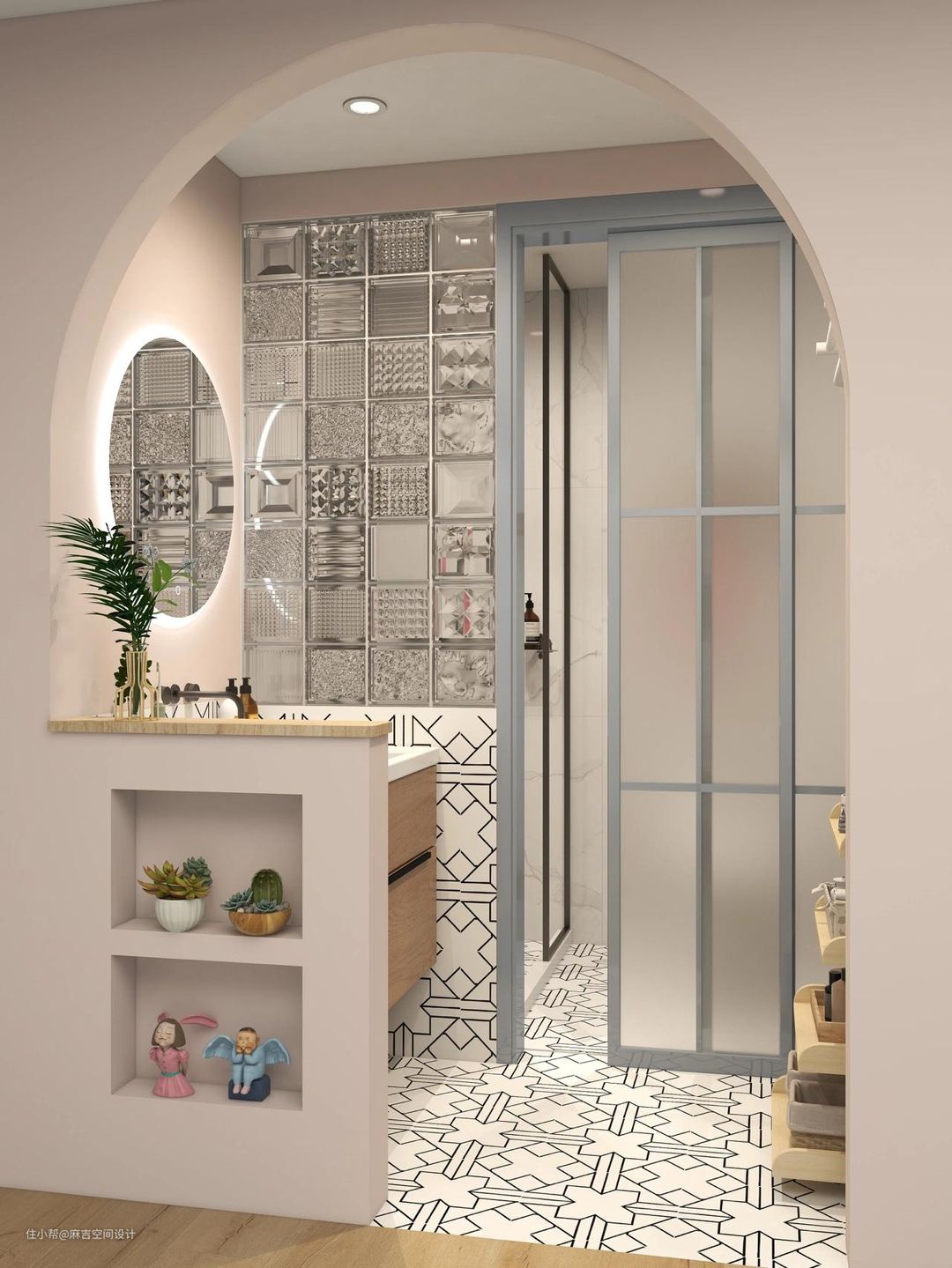 卫生间半圆形玻璃砖隔断,有种“犹抱琵琶半遮面”的韵味。