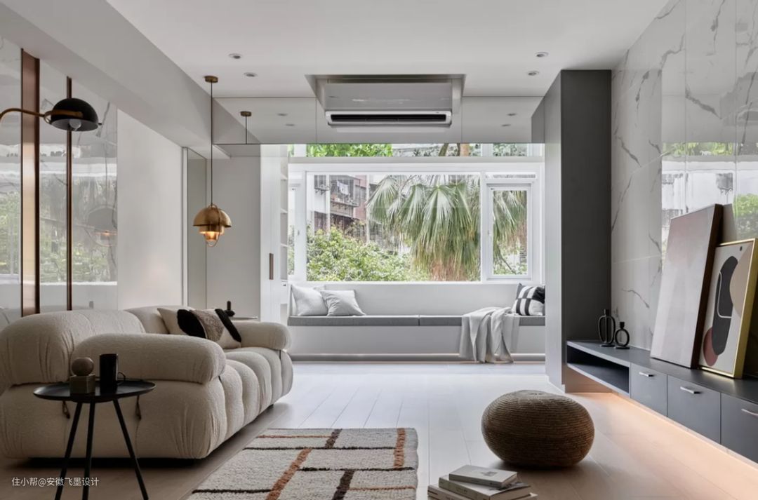 如果不喜欢L型玻璃窗的设计,用普通的平开式窗户代替也行。不仅能隔绝风吹雨淋,还能将阳台空间打造成全家人的休憩空间。可以给下方添加一个舒适的卧榻,与客厅合二为一,让阳台拥有更多的可能性。