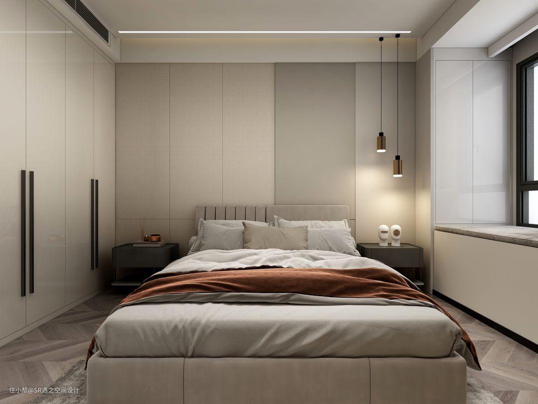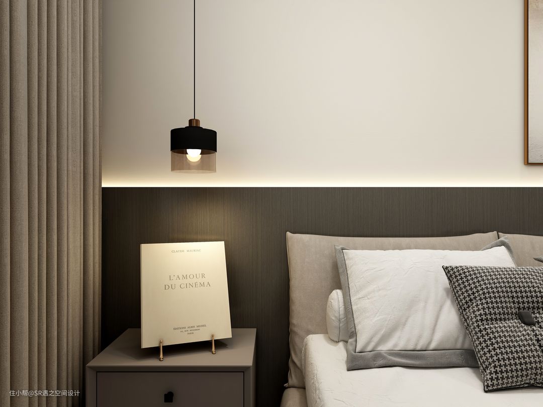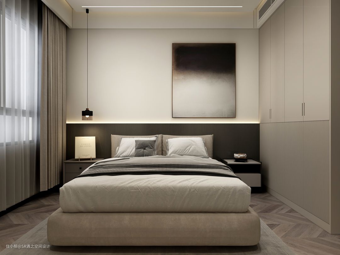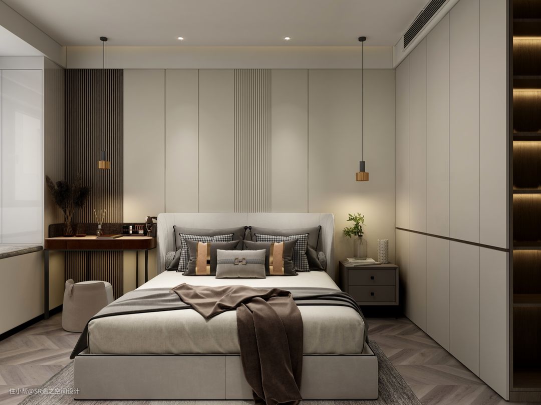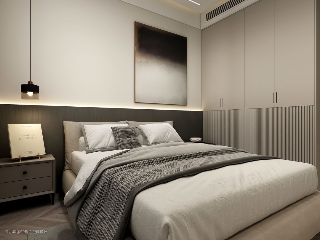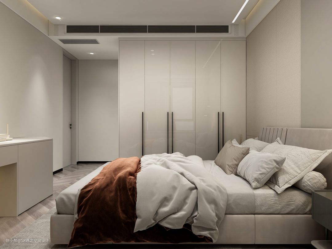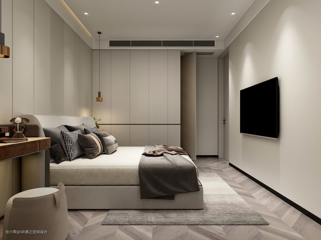 客卧柜体也是采用流行的隐藏式拉手设计,侧面壁柜也是精心设计,美观实用,空间搭配以温馨舒适为主,色彩也是部分区域点缀!