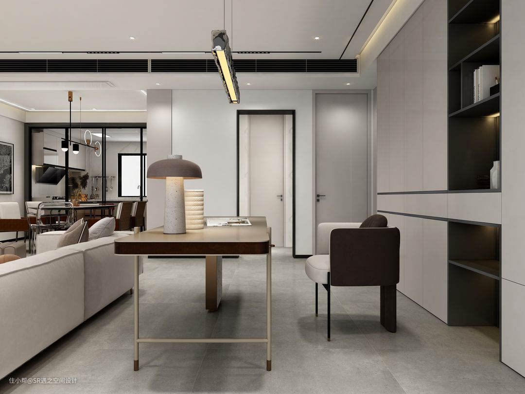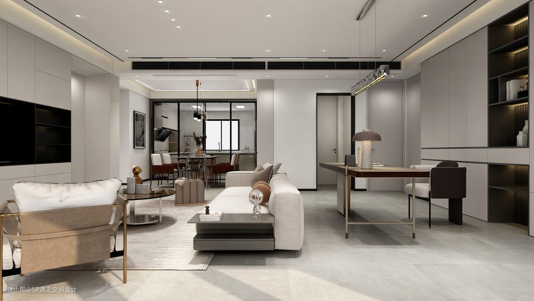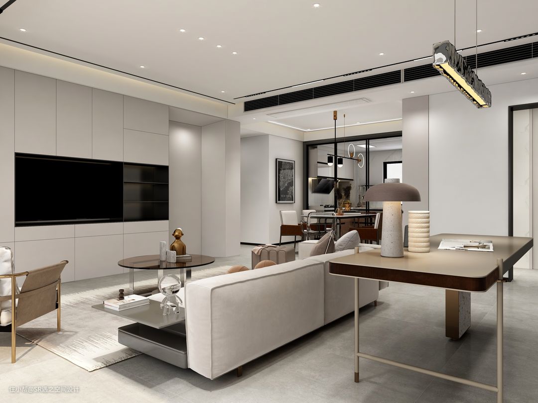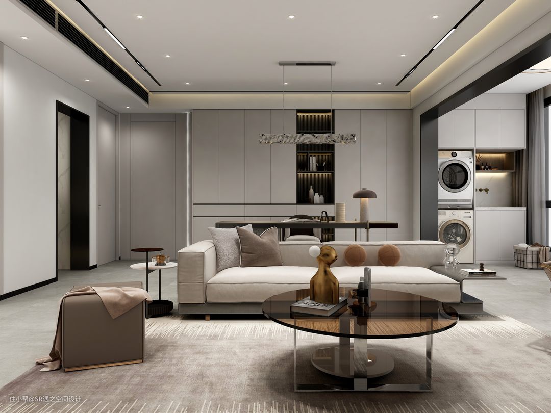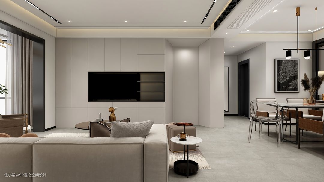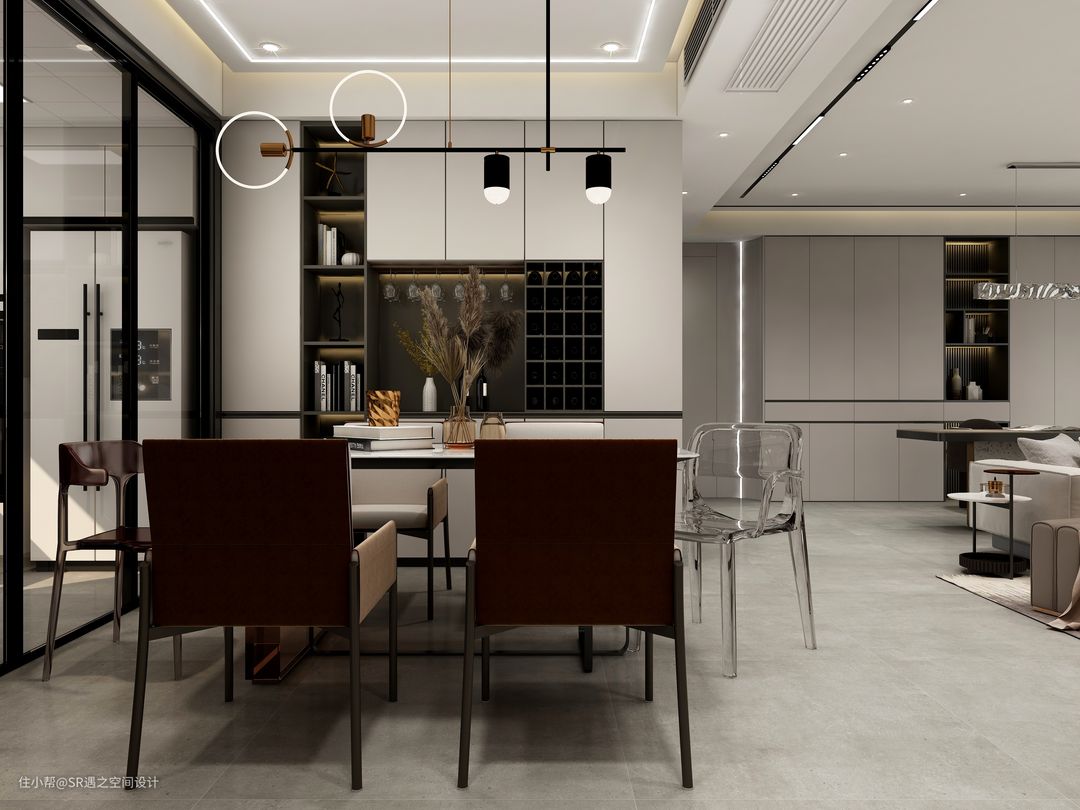客餐厅以奶咖色搭配深色柜体及家具,显示一定的深浅对比,凸出空间的氛围,金属,玻璃,水波纹的元素点缀出空间质感,全屋的木作及家具搭配也是精心挑选!