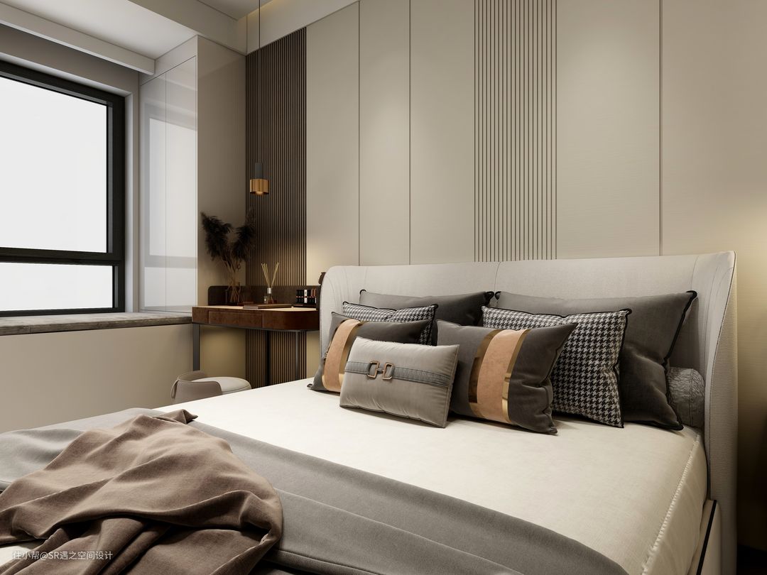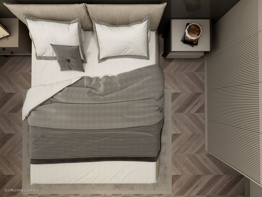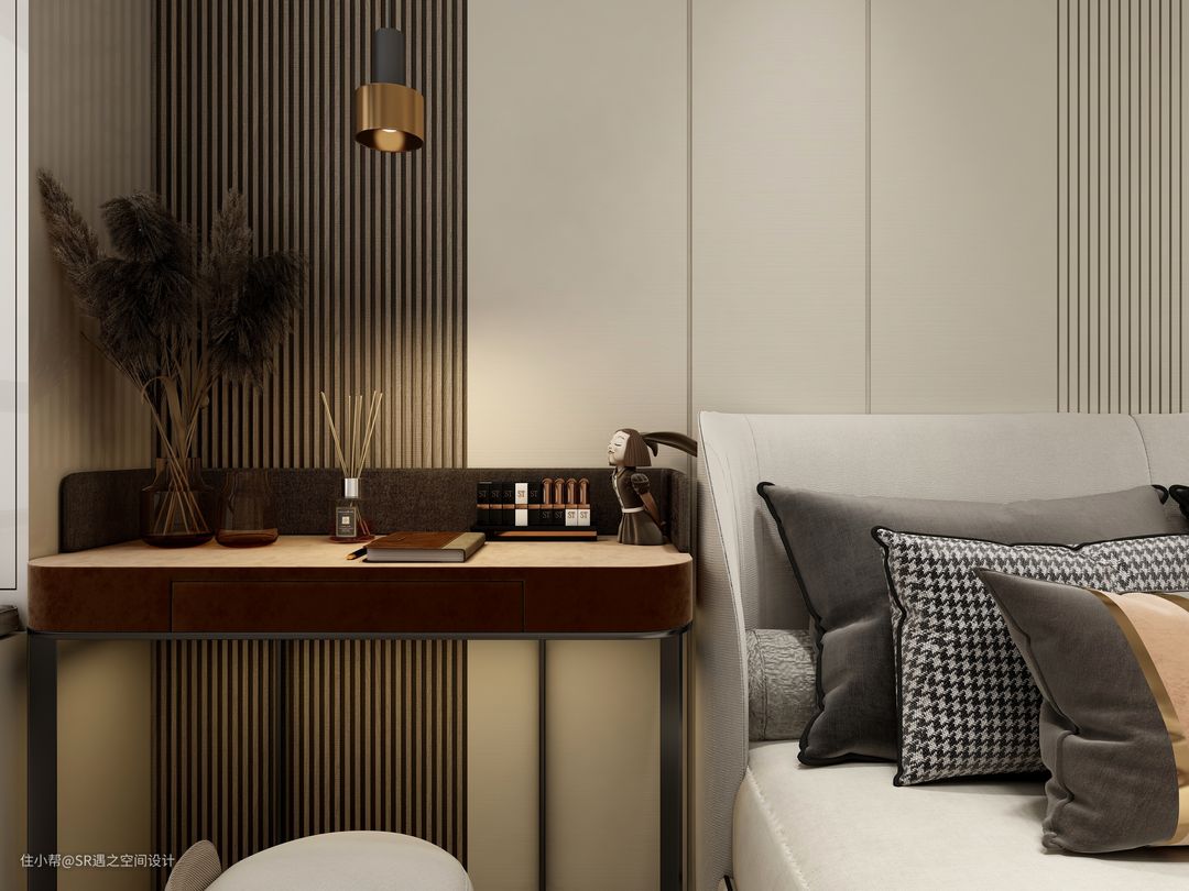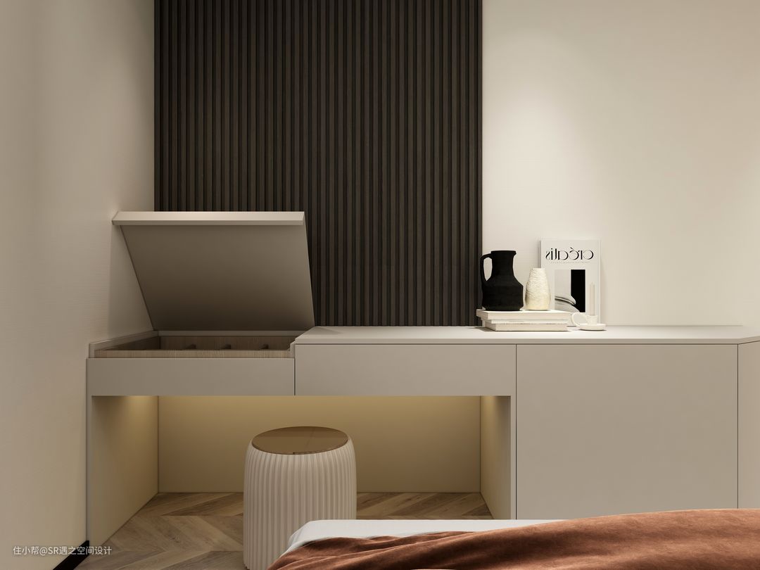 次卧背景墙与柜体分段处衔接,使得空间小而具有一定的延展性,格栅与平板的搭配,疏密结合,黑白对比!