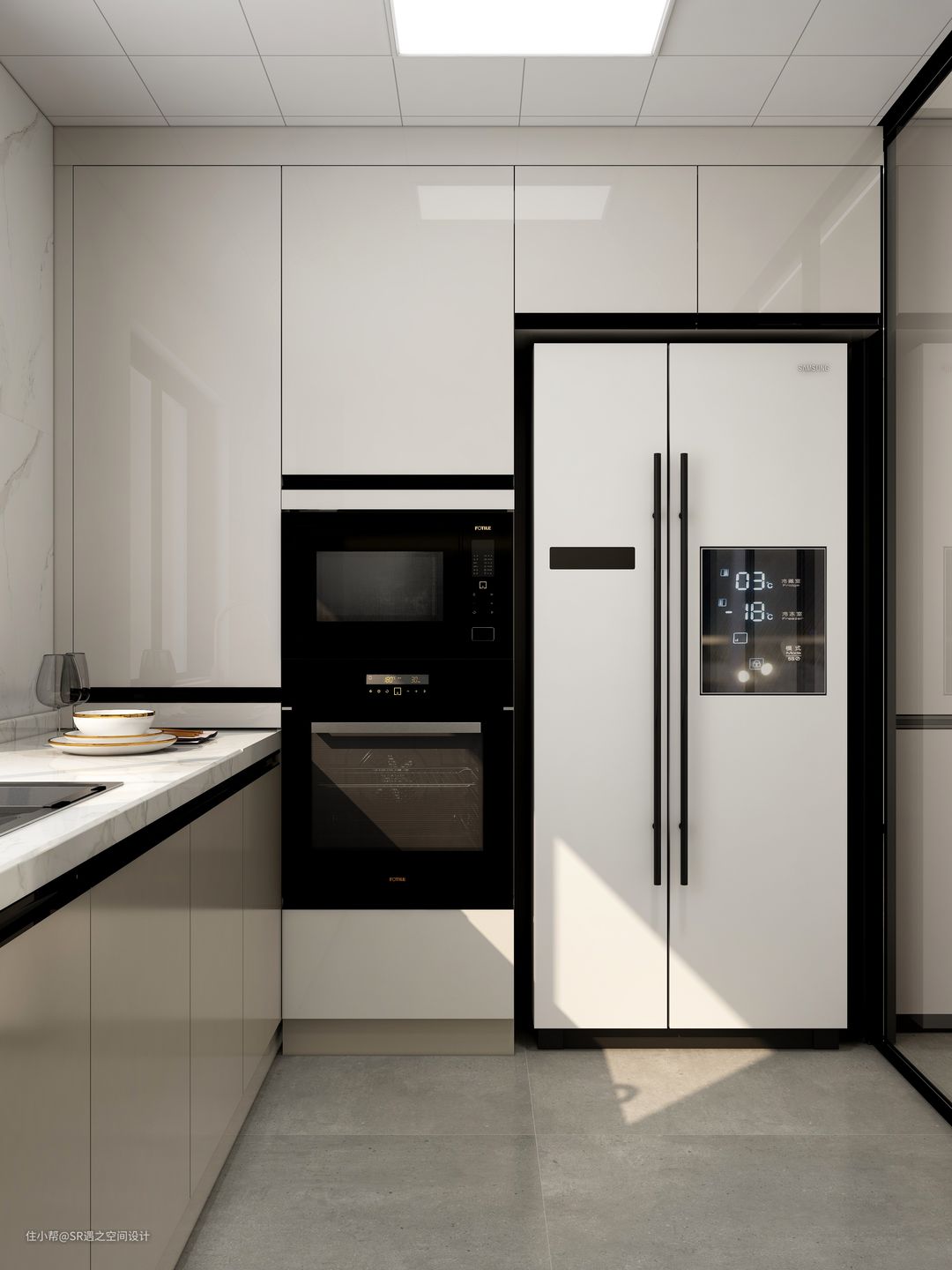 厨房也是采用分色设计,奶咖色与高光的烤漆面搭配,清爽简约!