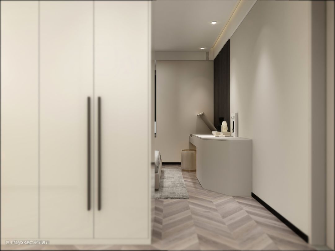 主卧隔出的独立衣帽间满足日常的储物,柜体双面设计结构更加人性化,长虹玻璃的点缀使得空间视觉感延伸,定制梳妆台也是个性之一,美观与实用的结合,空间内色彩不多,温馨十足!