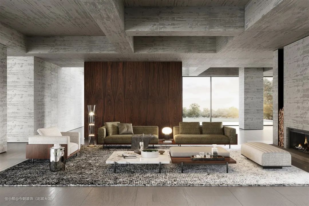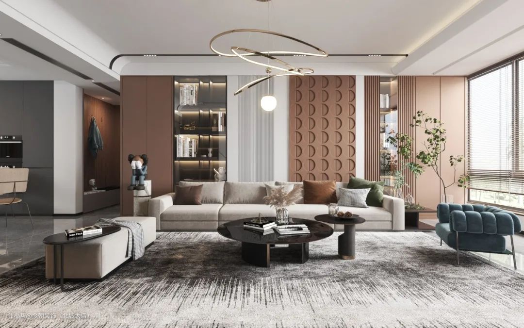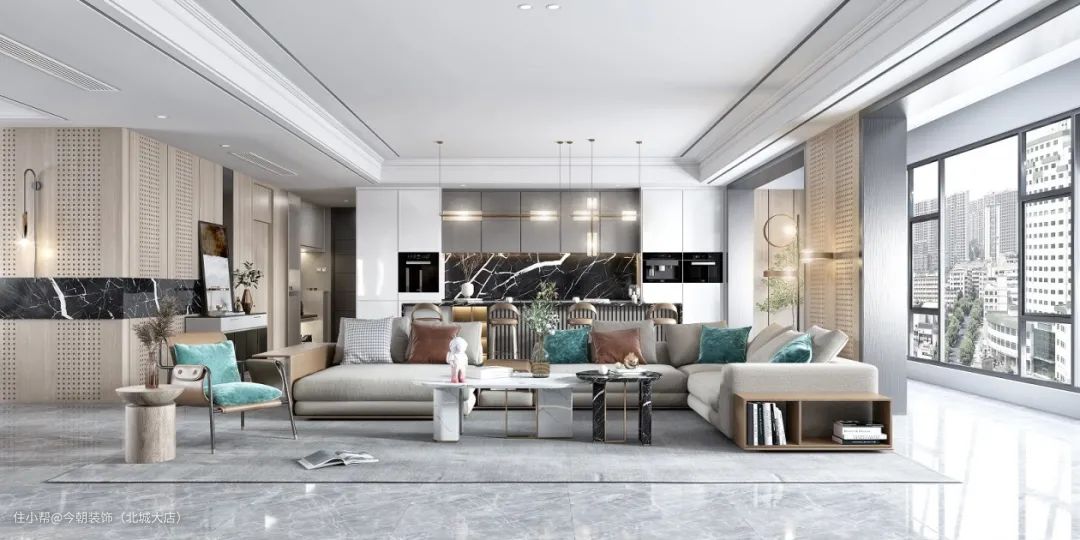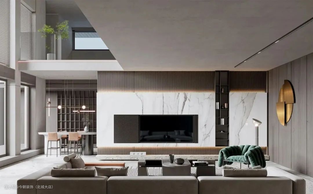 大横厅的户型,若是横梁位于客厅中间,可以将电视移到梁体下方,打造一面电视墙,不仅能够很好地实现大空间的功能分区,保持舒适的观影体验,同时转移视觉焦点,弱化横梁的突兀感!