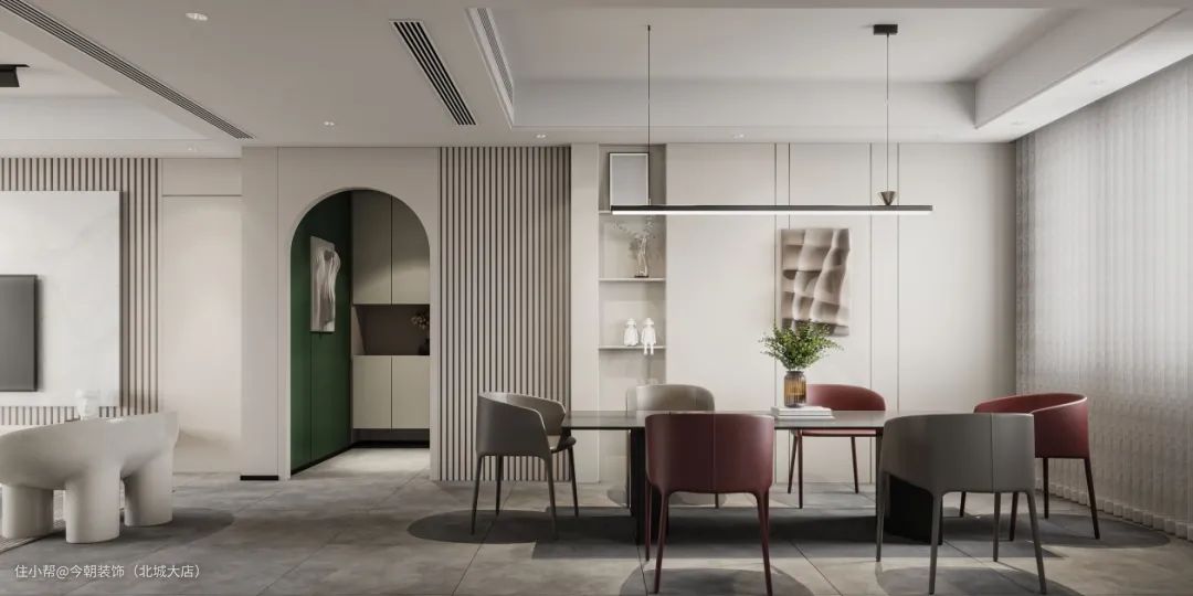 除了在顶面设计上下功夫,横梁还可与墙面结合,与墙面一起做拱门造型,将视觉重心从梁转体变为门洞,装饰设计感强。