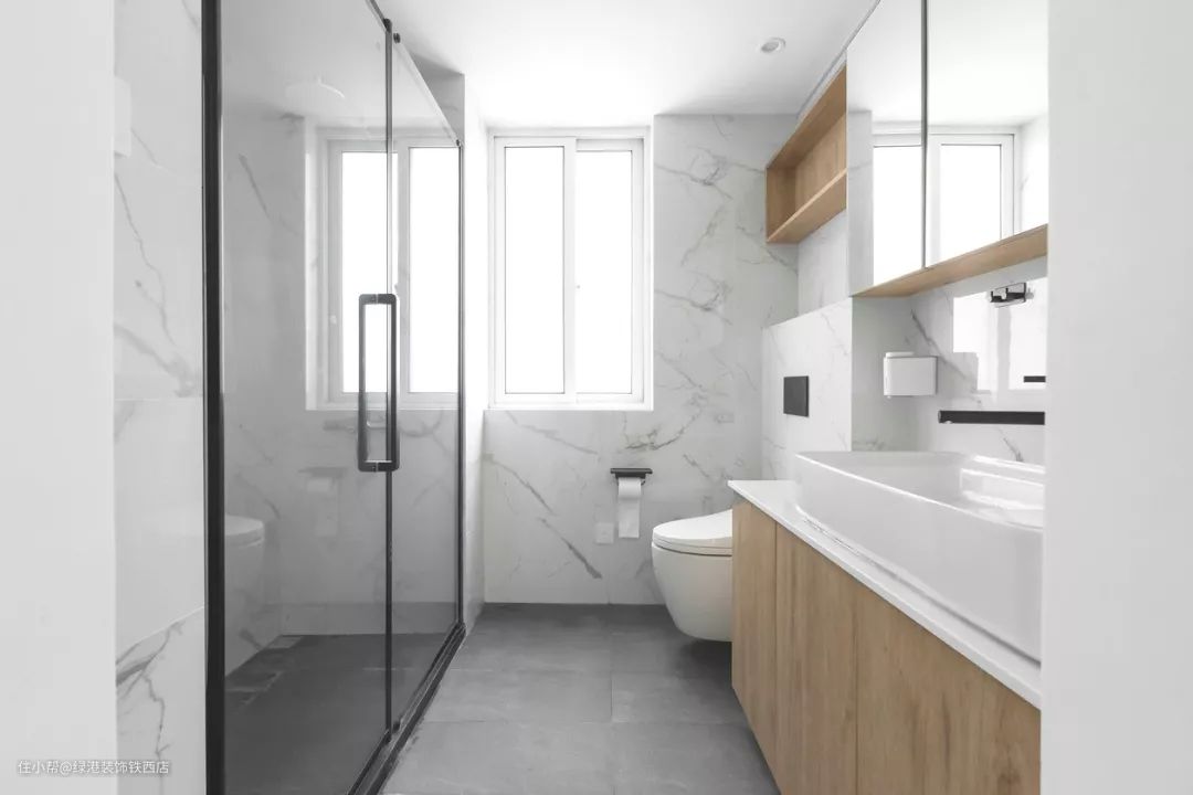 主卫由落地式改成壁挂式马桶,方便地面日常清理,淋浴花洒的对面砌了壁龛,方便洗浴用品的摆放。另外采用了浴室柜+镜柜的组合,丰富了储物空间。