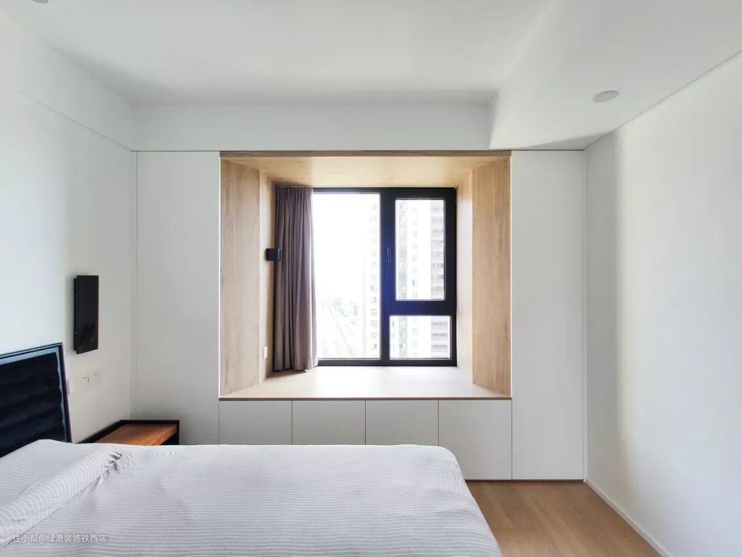 主卧的背景墙采用不对称设计,左侧吊灯,右侧壁灯,增加感官的变化。主卧最大的亮点莫过于飘窗柜,飘窗柜和常规不同,虽然做了围合式的设计露出窗户,但在内侧两边做了见光板斜向的开口设计,可以将光线更多的引入室内。在观感上看上去不压抑,飘窗柜正面视角,颜值非常能打,又兼顾了储物空间。