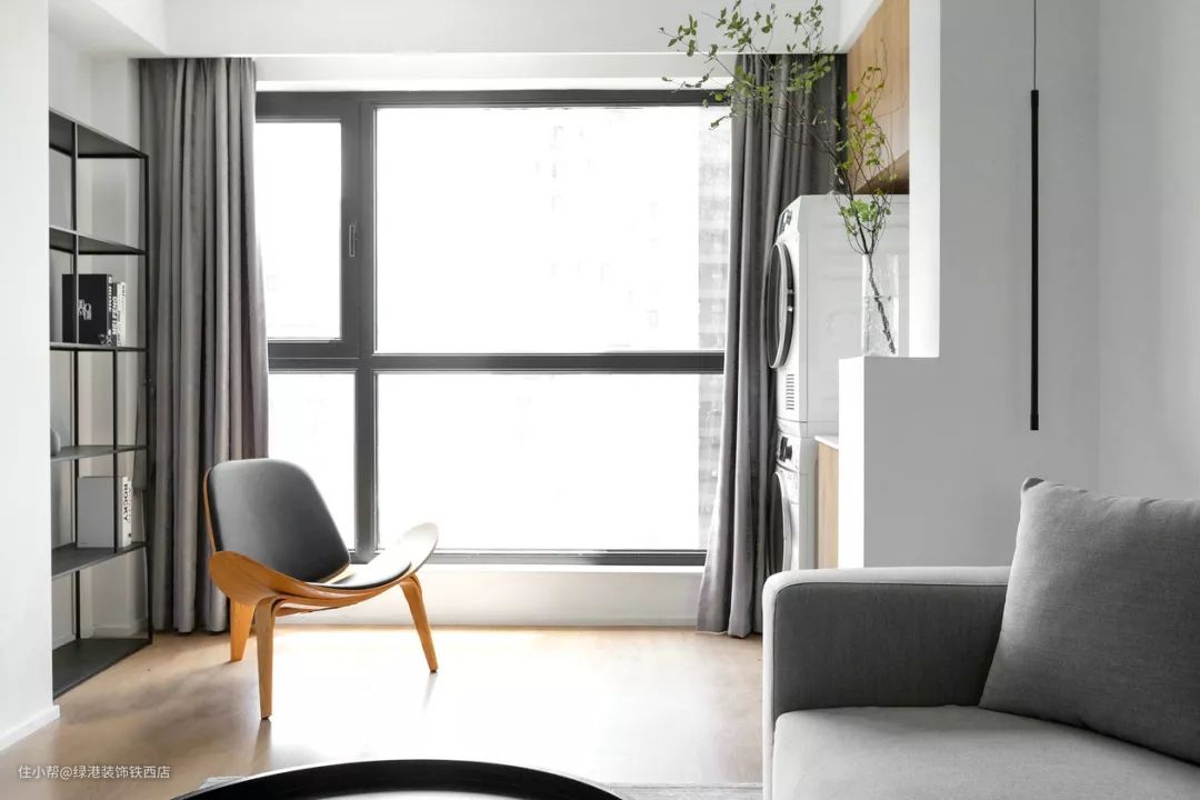 沙发的一侧选择圆柱造型的极简吊灯装饰,与整个空间搭配效果非常和谐,观感极佳。另一边是开放式阳台,放置洗衣机和烘干机,旁边安装生活水池柜,上面放置一盆绿植,从墙体凹处看,别有一番雅致。阳台的窗户最大化分割空间,保证窗外景色的完整性。
