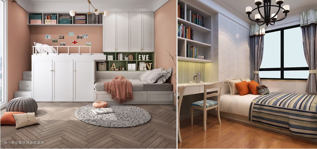 孩子的玩具、衣服加起来是非常多的,空间的储物能力一定要提升,传统的衣柜——床——书桌的布局会浪费一定空间,明显不够收纳。