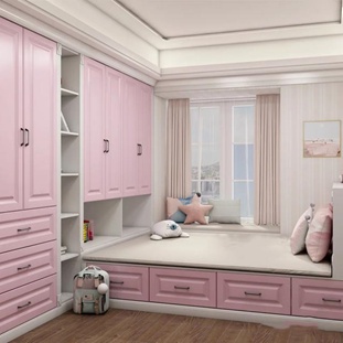 儿童房的书桌不建议和书柜分开,为了方便孩子拿取,所以书桌的摆放也很有讲究,用L型的转角书柜代替床头柜,可以利用空间,或者将书柜放置在靠衣柜一侧,留出过道。