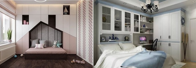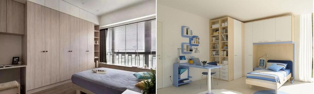 还有一种常见的布局方式会在靠墙一侧摆放衣柜,床和衣柜之间留出距离,但这种情况打开衣柜后留出的空间只能站人,完全不能用作活动范围,大大缩小了孩子的活动动线,针对这种情况我们可以床和衣柜一体的样式,更省空间。