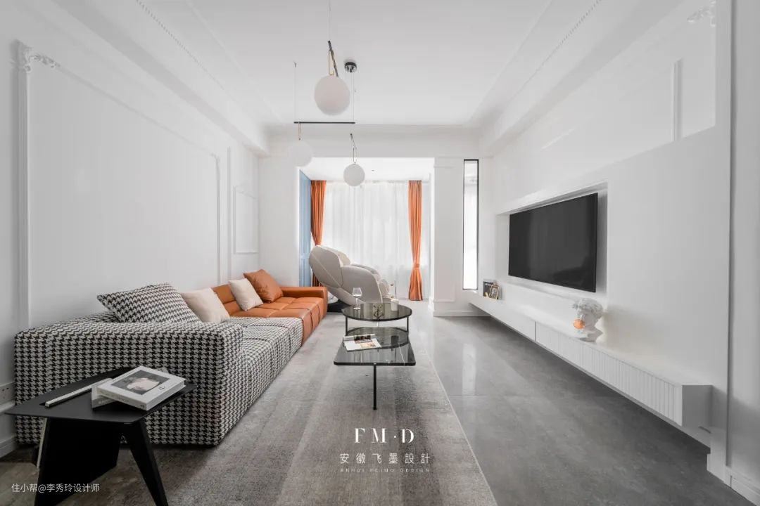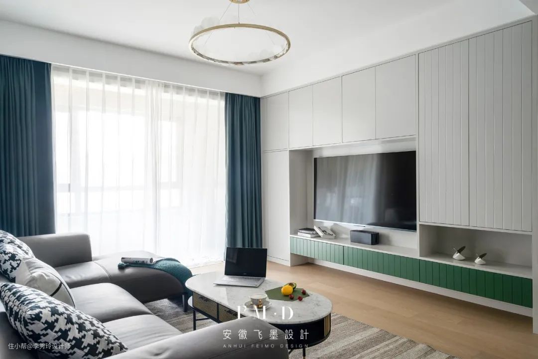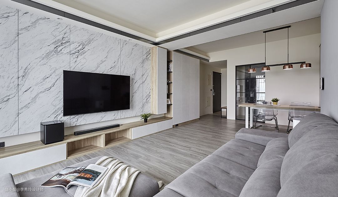 电视背景墙打造满墙的封闭式柜体,储物功能超级多,整个客厅也能保持干净整洁。