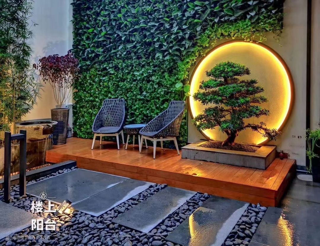 ² 如上图:右侧做了一面植物墙,放上休闲桌椅,简易圆形灯带造型搭配松科松属植物,还做了些日式小景观(石灯,逐鹿流水等),营造意境;整个布局干净舒适,宁静悠远,有禅意的氛围。