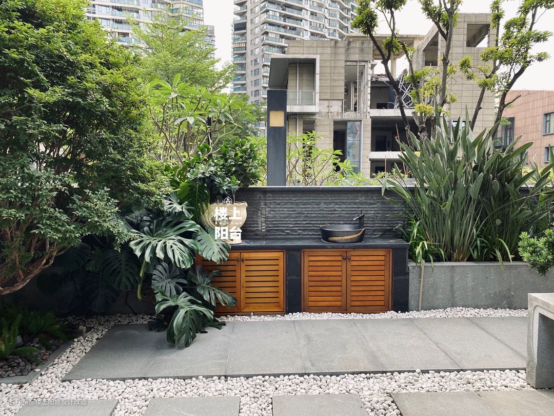 ² 如上图:户外添置收纳柜增加储存空间,增加洗手池,清洗茶具等不必在厨房露台之间“奔波”。地面的铺装主要以石英砖地板和自然石板沙砾(鹅卵石)结合,简单干净,方便打理
