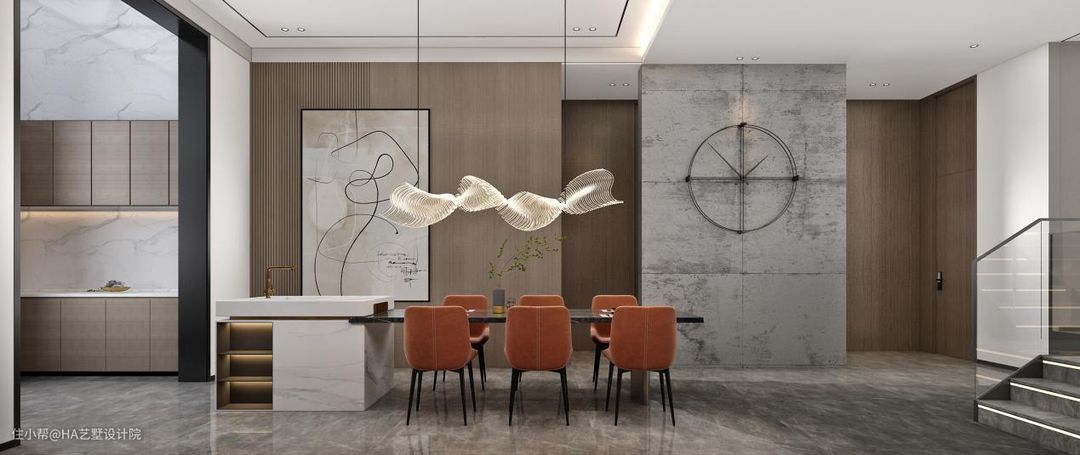 餐厅背景墙分成两部分,一部分以原木色木格栅作为铺垫, 一部分采用浅灰色壁布进行装饰,墙上悬挂有抽象画和简易钟表,时尚感爆棚。中间设置了一处小吧台,吧台配备了水管,可以进行水果和菜品的洗刷,更加方便了生活。从吧台延展出六人餐桌,橘红色的座椅更显时尚,配有一款造型独特的餐厅灯,整个餐厅颜值满分。