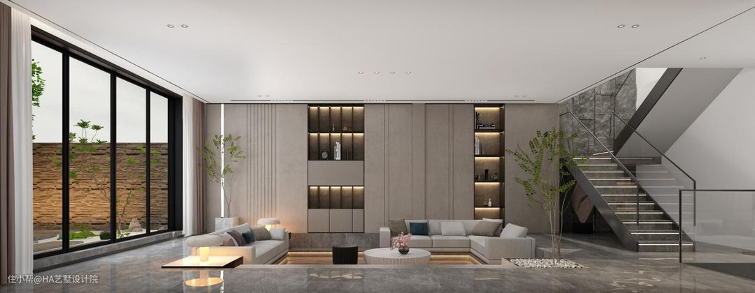 电视背景墙中部留有悬挂电视的位置,两侧设计了储物柜和抽象挂画,最具特点的设计是设计师将客厅主要待客区设置成了下沉式,使得待客区域成为更加独立的功能区