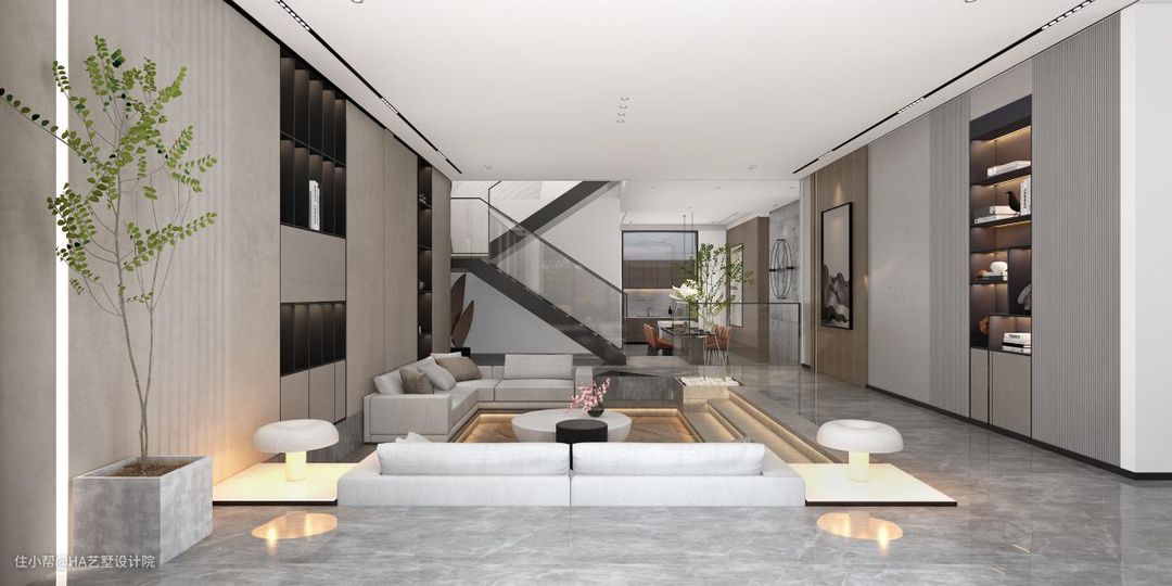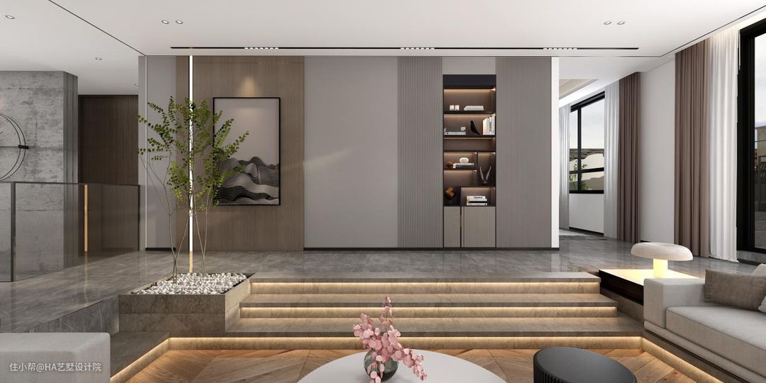 下沉区域的四角有设置的小矮灯,有种植的室内绿植,既烘托了客厅氛围,也为客厅增加生机与活力。下沉区域铺设了木地板, 脚感更加柔和也更为温馨,一套浅白色沙发和圆形茶几相互呼应,围绕下沉式台阶全部做了线型灯带进行补光,整体效果一级棒。