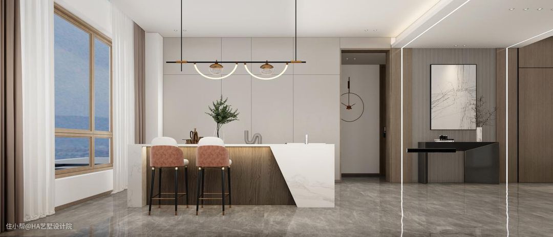 二楼的另一侧设计师设计成为一处水吧,顾名思义,这里能够满足业主自己去研制一些饮品的要求,比如磨咖啡、调红酒,配合这款月牙形的吊灯, 颇有一番酒吧前台的感觉。待饮品调试完成后,便可以在旁边的落地窗向外远眺,欣赏窗外的美景。